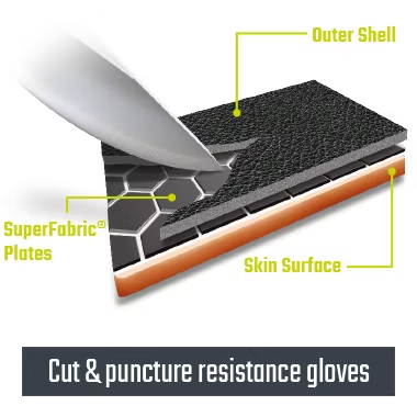 SuperFabric® brand material is a proprietary finishing process that configures tiny guard plates onto performance fabrics that help provide resistance against the harshest hazards. Guard plates arrest, trap and block needles and other hazards.