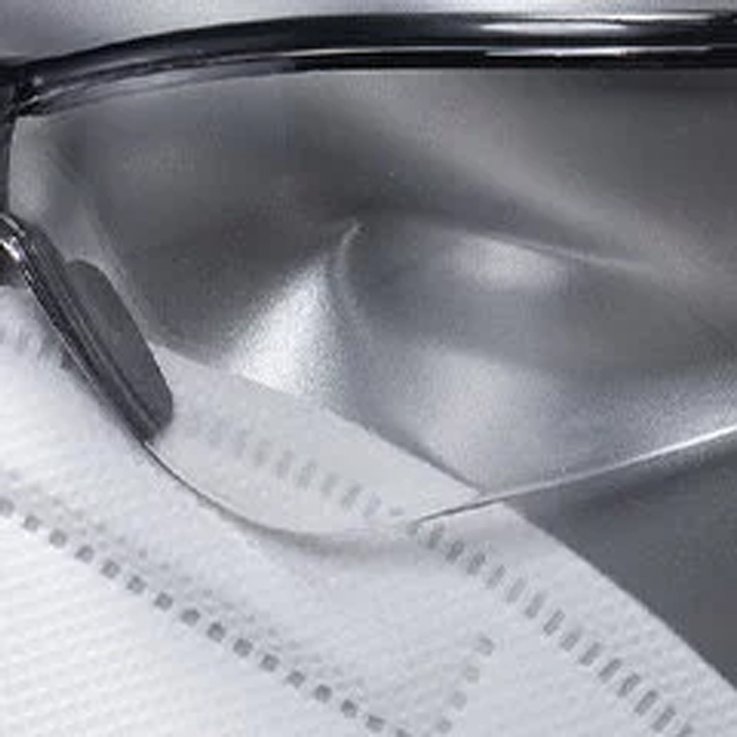 The 3D preformed mask shape gives an exceptional mask/face seal and the lens curvature reduces and gap between the eyes and the spectacle.